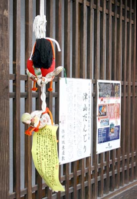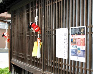 写真は、城東町並み保存地区にある作州城東屋敷の軒先に吊るされた「くくりざる」。隣は当「津山だんじり保存会館」のポスター。作州城東屋敷には、当会館が設置したタッチパネル式情報端末「