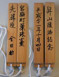 写真=上から先導役の拍子木、昭和初期の大神輿の拍子木、現在の大神輿の拍子木